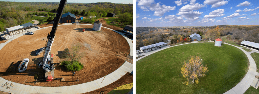 Significant attention was also given to honoring the area’s agricultural heritage. The Brown-Forman Silo Center is a great example of this. The site’s 60-foot silo, a remnant of the Jean Family dairy farm that operated on the property for seven generations, is a focal point of the park. It has been renovated and converted into an observatory deck, where visitors can climb the 109 spiraling stairs to enjoy 360° views of the surrounding fields and trails. The nearby shed, once used to house the farm’s feeding trough, was converted into the Farmer’s Table picnic shelter. The Pignic Barn now stands where the pig barn once stood.