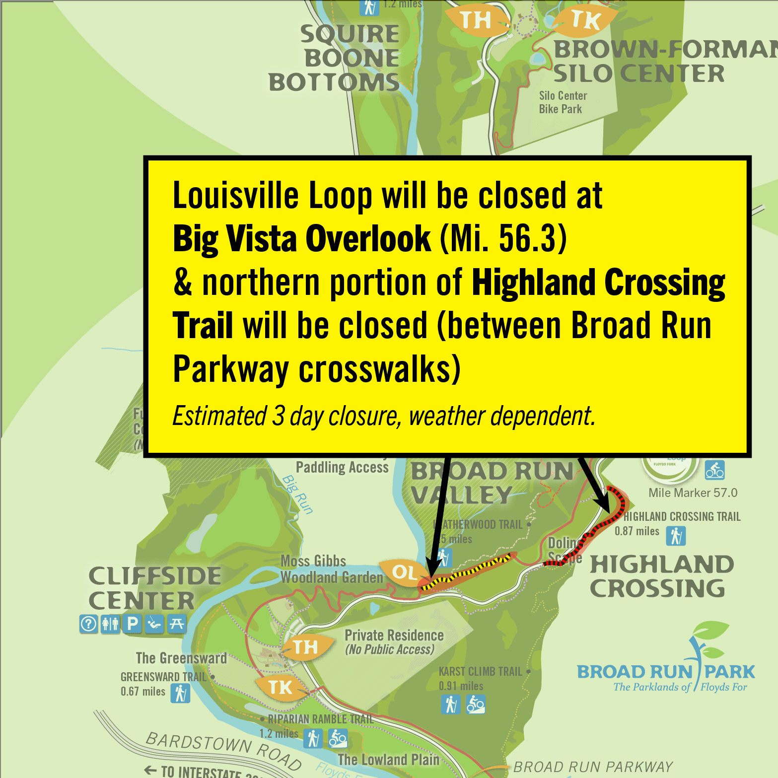 The Louisville Loop will be closed at the Big Vista Overlook (Mile Marker 56.3), and the northern portion of the Highland Crossing Trail will be closed between the crosswalks along Broad Run Parkway. Work will begin Wednesday, April 15, and is expected to last only a few days. The Big Vista Overlook Parking Lot will remain open.