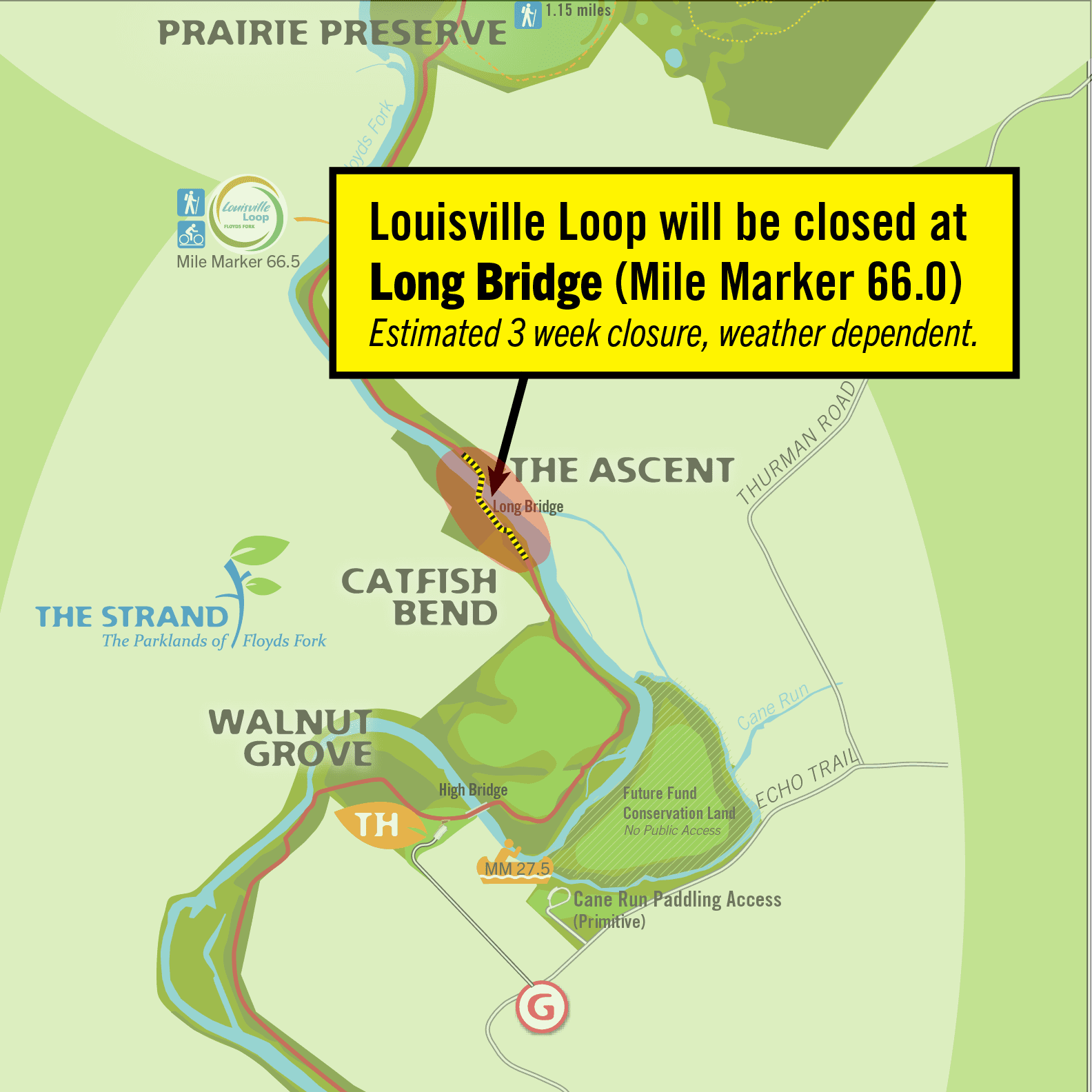 The Louisville Loop will be closed at the Long Bridge in the Ascent (Mile Marker 66.0). Work will begin Tuesday, April 14, and is expected to last approximately three weeks, depending on weather and other conditions.