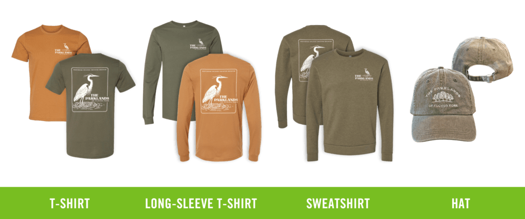 This month, The Parklands is celebrating the great blue heron with a collection of limited-edition shirts and sweatshirts available through our merch sale fundraiser. Each shirt features a two-sided design honoring this iconic park inhabitant.