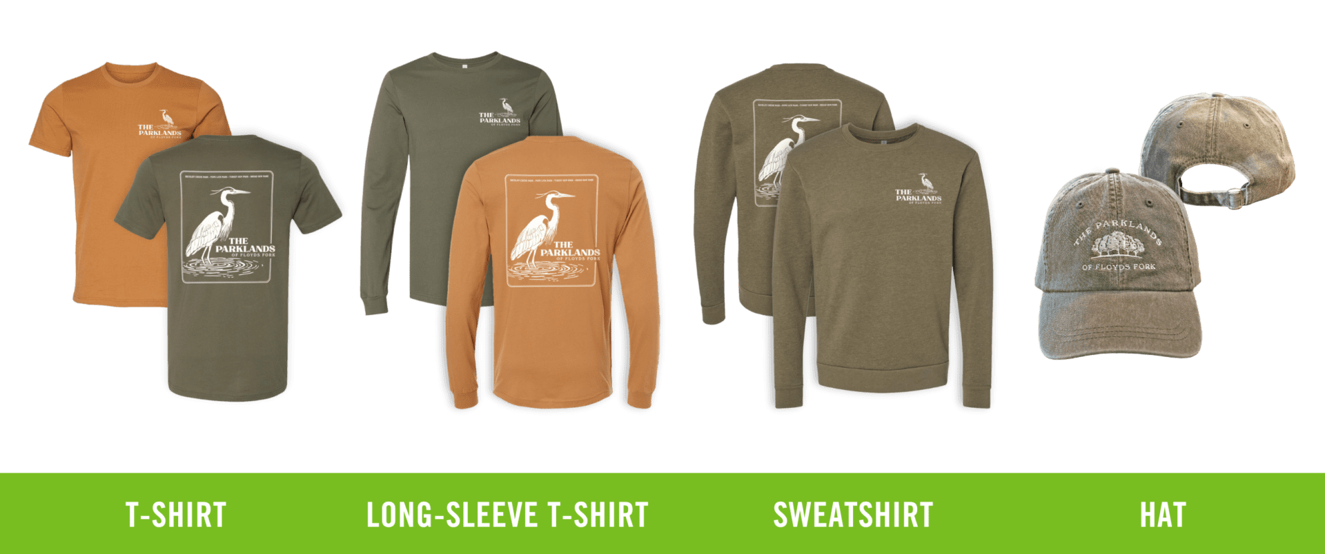 The 2025 collection includes adult shirts in two colors, with short- and long-sleeve styles and sizes ranging from XS–4XL. (Youth shirts are available in the short-sleeve green T-shirt.) Cozy sweatshirts are also available in adult sizes XS–3XL.
